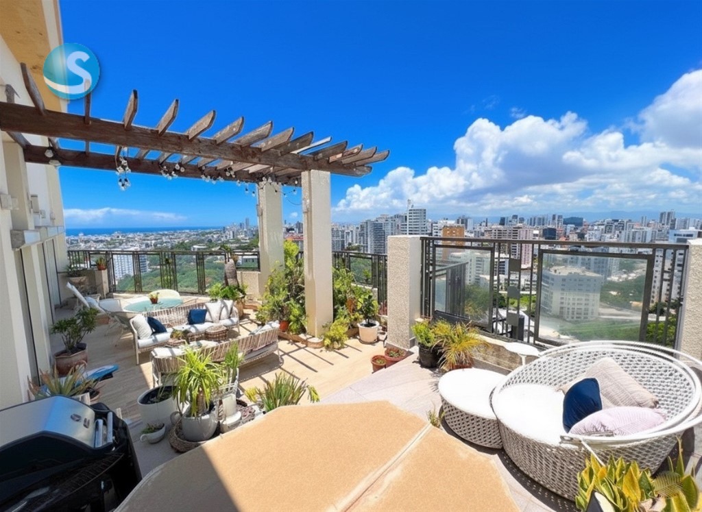 Espectacular Penthouse de 2 niveles con una vista panorámica única e impresionante vista al Mar - 4 habitaciones - 4.5 baños - Amplio Balcón/Terraza con vista a la ciudad y al Mar - Sala - Comedor - Sala de Estar - Cocina/Desayunador - Área de lavado - Cuarto de Servicio - 4 parqueos - Parqueos para visitas - Totalmente Remodelado - Planta Full - Seguridad 24*7 - 2 Niveles - Piso 23 - Mantenimiento: RD$24,900 Areas Sociales - Piscina - Terrazas Precio de Venta: US$ 1,100,000