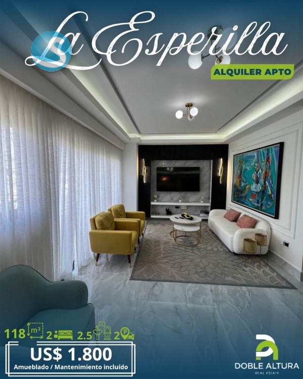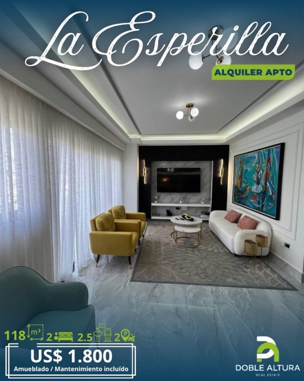 Apartamento de lujo amueblado full de 2 habitaciones en lo mejor de La Esperilla??Area social completa, piscina, gym, terraza, vista despejada?? Torre nueva, próxima al parque? Precio Alquiler Amueblado: US$1,800 Mantenimiento incluido Características: -118Mts nivel 5 -2 habitaciones c/u con baño -2.5 baños -Baño de visitas -Cocina con desayunador -Sala amplia -Balcón frontal con vista despejada -Closet de ropa blanca -Área de lavado -Habitación de servicio con baño -2 parqueos paralelos -Cerradura inteligente -Decorado finamente Amenidades de la Torre: -Lobby climatizado -Planta full -2 Ascensores -Área social -Área de niños -Piscina -Terraza -Bar -Gimnasio -Portón eléctricos -Intercom -Seguridad 24/h