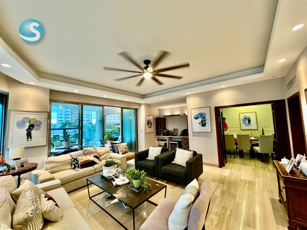 Exclusivo y elegante apartamento ubicado en Ensanche La Esperilla 332 mts neto 365 Total Tres (3) habitaciones Walking - in clóset en cedro 3.5 baños Baños principal con jacuzzi Comedor Cocina con comedor integrado Walk- in pantry Comedor Sala Estudio Bar Amplio balcón Lobby interior privado Área de lavandería Habitación de servicio Dos (2) parqueos techados paralelos Locker Características Walk in clóset en cedro Pisos de mármol Techo en sheetrock Aire central Línea blanca Shutters en todas las áreas Ascensor exclusivo que abre directamente al lobby interior Áreas social Salón de eventos Piscina Bar Gimnasio Doble sauna Área de niños Seguridad 24H Portón eléctrico Lobby climatizado Dos (2) Planta full Gas común Tres (3) ascensores Precio de venta: US $595,000.00 Mantenimiento: $36,000.00 (El mantenimiento incluye servicios permanentes de plomero, pintor y electricista )