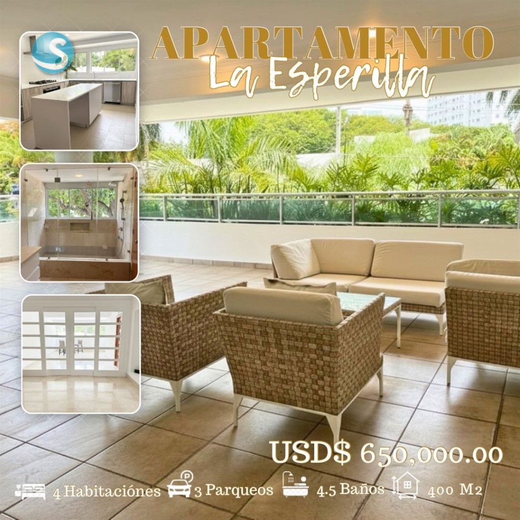 Apartamento de Lujo en La Esperilla Amplio y elegante apartamento de 400 m² más 80 m² de terraza privada, con una distribución funcional y acabados de primera calidad, ubicado en una de las zonas más exclusivas de Santo Domingo. Distribución y características: 4 habitaciones, cada una con su baño privada 4.5 baños Walk-in closets en madera de cedro Amplia sala principal Comedor formal Family room o estudio Sala de estar o área de televisión Cocina fría y cocina caliente Área de lavado independiente Habitación y baño de servicio Terraza privada de 80 m² ideal para reuniones sociales Pisos en mármol 3 parqueos techados Amenidades de la torre: •Lobby amueblado y climatizado •Gimnasio completamente equipado •Área infantil •Seguridad 24 horas con acceso controlado •Ascensores modernos •Áreas sociales y de esparcimiento Precio de venta: US$650,000