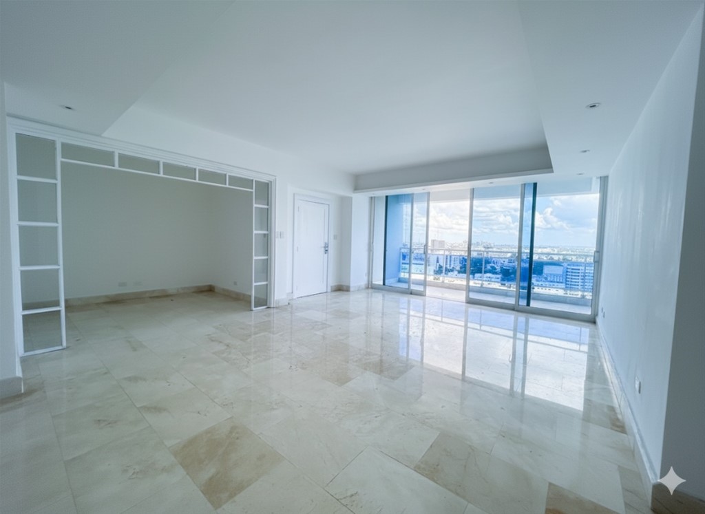 La Esperilla Características principales: * 238 metros cuadrados * 3 habitaciones (2 con balcón con vistas mar-ciudad), cada una con su baño privado y walk-in closet * Amplia sala, estar y comedor * Balcón principal con vista al mar * Cocina renovada y moderna * Baño de visita * Área de lavado y cuarto de servicio con baño * 2 parqueos (espacio para un tercero pequeño) Amenidades del edificio: * Área social con piscina * Gimnasio equipado * Sala de eventos Multiuso * Área de juegos para niños Mant: RD$14,600 Precio: US$355,000