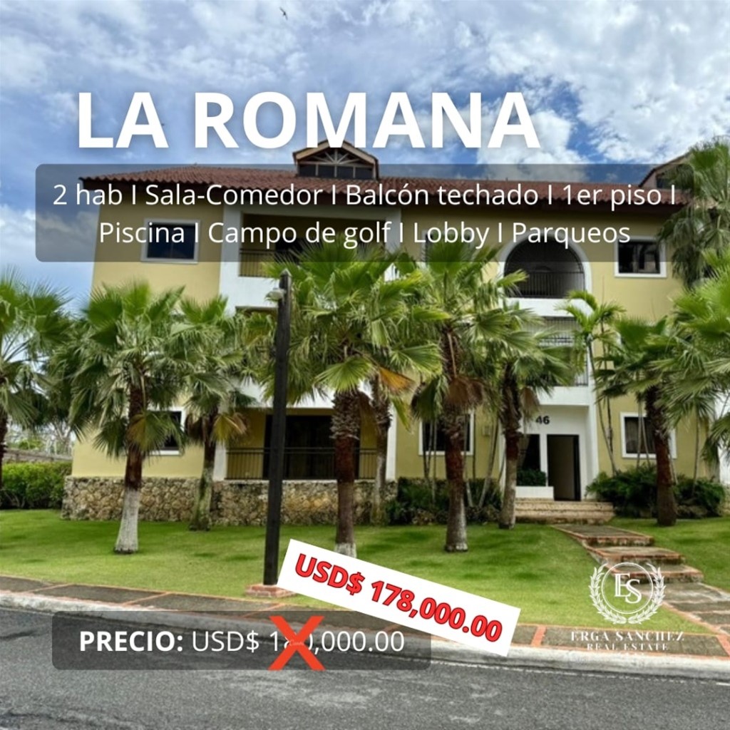 APARTAMENTO TOTALMENTE AMUEBLADO EN LA ROMANA - Excelente Oportunidad CARACTERISTICAS Y AMENIDADES: 1er piso 2 habitaciones - Habitación principal con Walking closet y baño privado 2 baños Espaciosa cocina Balcón techado Medio baño de visitas Hermosos campos de golf Amplia piscina Lobby Amplia Terraza techada Área social PRECIO: US$ 178,000.00