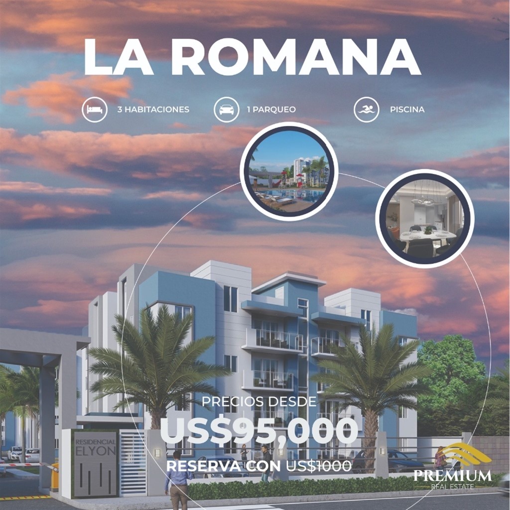 La Romana Reserva con: US$1,000 3 Habitaciones 2 Baños Sala Comedor Cocina Balcón Área de 1 Parqueo Áreas sociales Piscina Área de niños Área de BBQ Precios Desde: US$95,000 Forma de Pago Separación US$1,000 Firma de contrato 10% del valor del inmueble Completa inicial 20% durante el proceso de construcción Contra entrega de inmueble 70% llave en mano