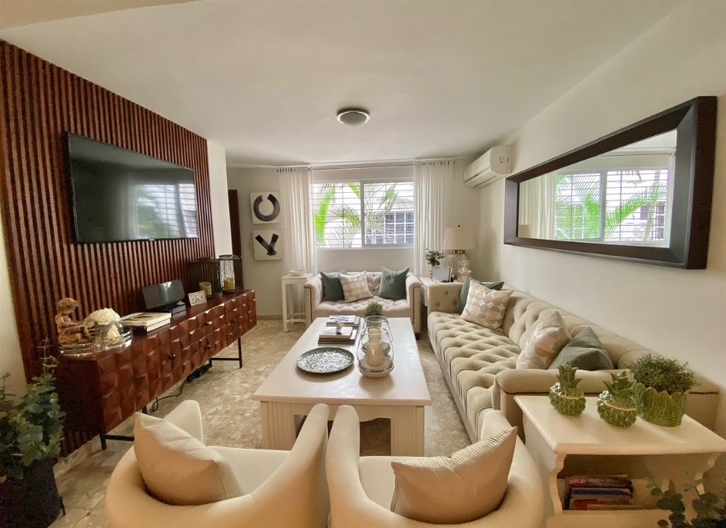 SE VENDE • en La Trinitaria, la zona más exclusiva y segura de la ciudad de Santiago, amplio apartamento de dos niveles con: • 3 dormitorios, el principal con su baño y sala privada • baño compartido para dormitorios secundarios • medio baño • 2 salas • comedor • cocina • cuarto de servicio con su baño • área de lavado • 1 parqueo techado • puertas, gabinetes y closets en roble • 152 metros cuadrados • US$ 218,000