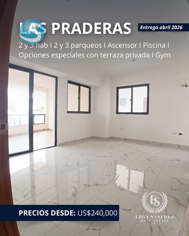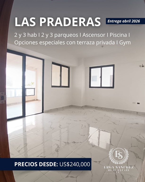 Proyecto de APARTAMENTOS con TERRAZA PRIVADA en Las Praderas | Entrega abril 2026 Vive en una de las zonas más céntricas y cómodas de Santo Domingo, a pocos minutos del parque y del Supermercado Jumbo. ? Apartamentos disponibles de 2 y 3 habitaciones ?? Distribuciones pensadas para tu comodidad CARACTERISTICAS Y AMENIDADES: 2 baños + 1/2 baño de visita 2 parqueos Cocina modular con isla Amplia sala y comedor Ascensor Planta full Gas común Área social para disfrutar en familia Gym Piscina Área de juegos para niños TIPOS: Opciones especiales con terraza: 3 habitaciones con terraza 3 habitaciones con terraza + 3 parqueos 2 habitaciones con terraza + 2 parqueos PRECIOS DESDE: US$240,000.00 Contáctanos para mas información #KL