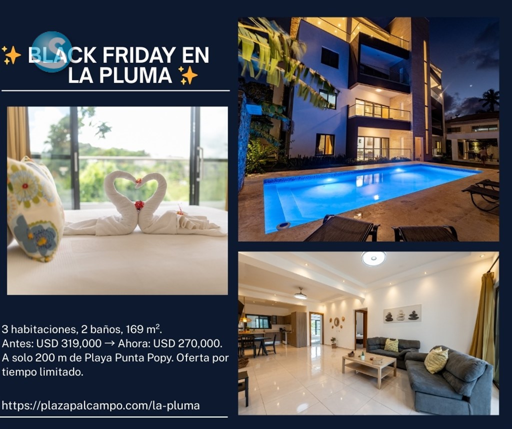 OFERTA ESPECIAL SIN INTERMEDIARIOS Apartamento exclusivo en Las Terrenas – Black Friday A solo 200 metros de la Playa, en el sector Casa Blanca. Proyecto La Pluma, edificio moderno de 4 niveles con solo 8 unidades. Amenidades Piscina iluminada, ascensor, portón eléctrico, planta eléctrica, aire acondicionado y línea blanca incluida. Residencial cerrado, jardines tropicales y parqueos paralelos. Airbnb Friendly – ideal para inversión y renta. Privacidad, exclusividad y alta valorización en el corazón de Las Terrenas de Samana Rep. Dom
