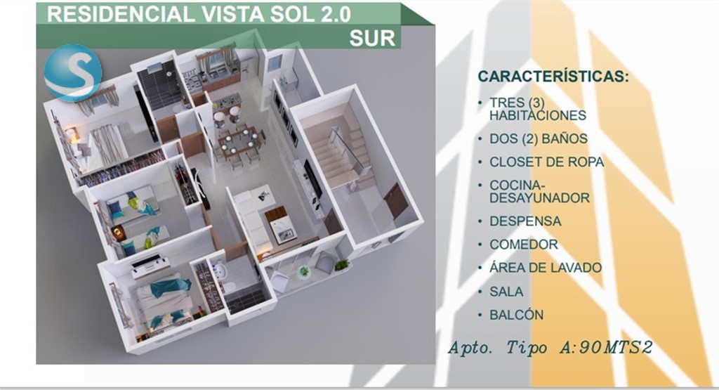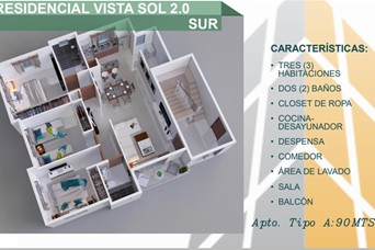 APARTAMENTOS EN VENTA – RESIDENCIAL VISTA SOL 2.0 Santiago de los Caballeros, República Dominicana Residencial Vista Sol 2.0 es un moderno proyecto habitacional diseñado para ofrecer seguridad, confort y una excelente calidad de vida, ubicado en una de las zonas de mayor crecimiento de la ciudad de Santiago. UBICACIÓN Vista Sol Sur – 4ta Etapa, La Barranquita Próximo a la intersección de las Avenidas Yapur Dumit y Olímpica Santiago de los Caballeros Apartamentos de aproximadamente 90 m². CARACTERÍSTICAS DEL PROYECTO Proyecto cerrado con verja perimetral Seguridad 24 horas Caseta de vigilancia Portón eléctrico con control de acceso Piscina Kiosco para actividades sociales Área de juegos infantiles Un (1) parqueo asignado por apartamento DISTRIBUCIÓN DEL APARTAMENTO Sala Balcón Comedor Cocina con desayunador Área de lavado Tres (3) habitaciones con clósets Habitación principal con baño privado Un (1) baño común PRECIOS – VISTA SOL SUR / VISTA SOL 4TA ETAPA 1er Nivel: US$92,174 2do Nivel: US$92,174 3er Nivel: US$92,174 4to Nivel: US$92,174 PLAN DE PAGO Inicial: 20% del valor del apartamento Separación: US$1,000 Gastos legales y administrativos: RD$8,000 (no reembolsables, junto con la separación) Primer mes: RD$100,000 Desde el segundo mes en adelante: cuotas mensuales desde RD$10,000 Ideal para vivir o invertir, con excelente ubicación, amenidades completas y facilidades de pago. Para más información, disponibilidad y proceso de compra, contáctanos.