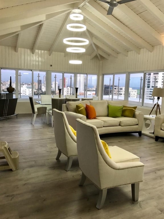 Cacicazgos. 952 metros cuadrados distribuidos en 3 Niveles/ 5 habitaciones + 5.5 banos +Estudio + oficina + 2 comedores + 2 cocinas + 4 parqueos y VISTA AL MAR PISOS 13, 14 y 15 - Distribucion por pisos: EN 1er PISO: En el primer piso tiene 2 hab con sus baños con clósets en cedro , sala, estar, Family, comedor, 1/2 baño, cocina caliente, cocina fría , cuarto de servicio. En el 2nd piso Hab principal, 2 hab con baños y closets en cedro, terraza con Gazebo y sala pequeña. En el Tercer piso Sala, comedor, área de juegos, estudio grabación, oficina, clóset de desahogo y terraza abierta con bar en coralina. Pisos en mármol y clóset en cedros 4 parqueos y locker. Torre con 2 ascensores + lobby climatizado + Salon Infantil y salon multiusos Ducto de Basura