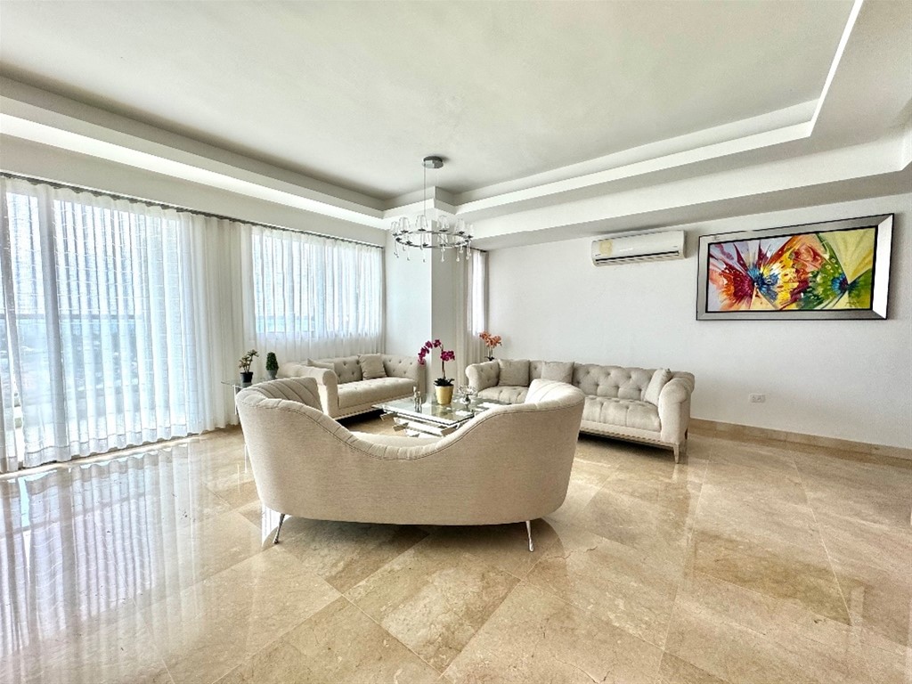 LOS CACICAZGOS Espectacular Apartamento en Moderna Torre con ubicación privilegiada. ALQUILER AMUEBLADO US$3,000 PISO ALTO CON VISTA AL MAR 240 metros neto 3 habitaciones + estudio 3.5 Baños Sala Comedor Amplio Balcón Cocina Cuarto de servicio Área de lavado 3 parqueos techados Dos Niveles de Áreas Sociales Piscina Jacuzzi Terraza Amueblada Gimnasio equipado Área Infantil Salon Multiuso Area de BBQ y Bar - Lobby finamente amueblado - Cuatro (04) Ascensores - Planta Eléctrica Full