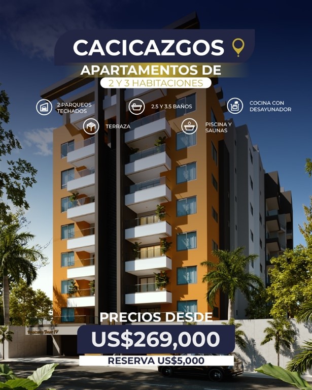 CACICAZGOS APARTAMENTOS DE 2 y 3 HABITACIONES Habitaciones Principales con W/C 2.5 y 3.5 Baños Sala Comedor Balcón Cocina con desayunador Área de Lavado Habitación de servicio 2 Parqueos Techados Locker DETALLES DE TERMINACIÓN: Pisos en Porcelanato Techos y Cornisas en Yeso Tope de Cocina en Granito Natural Grifería Importada Preinstalación de A/A SERVICIOS Y ÁREAS COMUNES EN ÚLTIMO NIVEL: 3 Ascensores de Última Generación Magnífico Lobby Climatizado Planta Eléctrica Full Sistema de Tratamiento de Agua Gas Común Intercom Sistema de Seguridad con Monitoreo 24/7 Área de Piscina y Saunas Lounge en Último Nivel Gimnasio Equipado Área de Juegos para Niños Salón Multiusos PRECIOS DESDE US$269,000 Forma de pago: - 5,000 Reserva - 10% firma contrato - 40% durante la construcción - 50% contra entrega