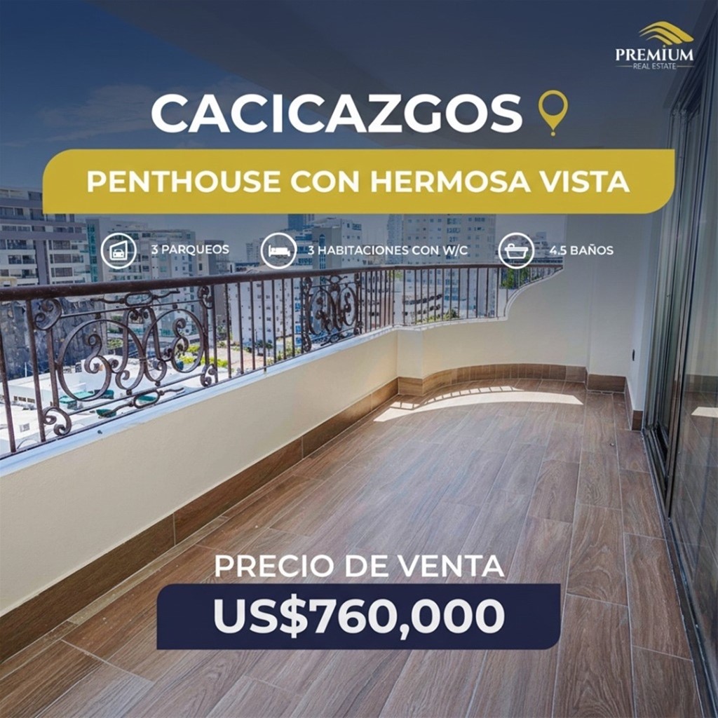 Los Cacicazgos Penthouse con Hermosa Vista y las mejores Terminaciones Piso 10 y 11 420 Metros Netos *Primer Nivel:* Balcón Amplio Cocina Fría-Caliente 3 Habitaciones cada una con W/C 4.5 Baños Sala Comedor Área de Lavado Cuarto de Servicio con baño *Segundo Nivel:* Terraza Privada Jacuzzi Family Room Habitación Principal amplio Closet y baño con tina *Amenidades: * 3 Parqueos Terminaciones de Primera Pisos en Mármol 2 Ascensores Gas común Planta Full …………………………………………….. Precio de Venta US$ 760,000