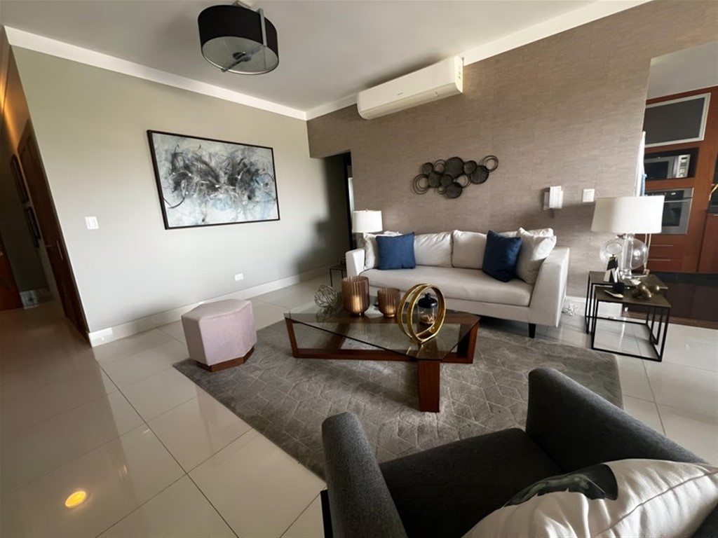 MLS #26-37 Descubre este moderno apartamento amueblado en alquiler, ubicado en el nivel 5 de una elegante torre en Los Cacicazgos, una de las zonas más exclusivas de la ciudad. Con una decoración minimalista y vistas al mar y a la ciudad, este apartamento te brinda el equilibrio perfecto entre confort y estilo en un entorno privilegiado. Características del apartamento: - Habitación principal con baño y walk-in closet - Habitación secundaria con baño y closet - Baño de visitas - Sala - Comedor - Cocina abierta con desayunador - Balcón - Habitación de servicio con baño - Área de lavado - 2 parqueos Amenidades de la torre: - Lobby climatizado - 3 ascensores sociales y 1 ascensor de carga - Seguridad 24/7 - Gas común - Ducto de basura - 2 plantas eléctricas full Área social en el último nivel: - Terraza-jardín estilo zen - Terraza destechada - Piscina infinita - Área de bar lounge - Baños y ducha - Cine privado - Salón multiusos - Gimnasio Vive en un ambiente moderno y acogedor, rodeado de espectaculares amenidades que te permitirán disfrutar al máximo cada espacio de tu hogar en una ubicación privilegiada.