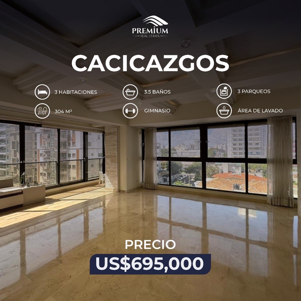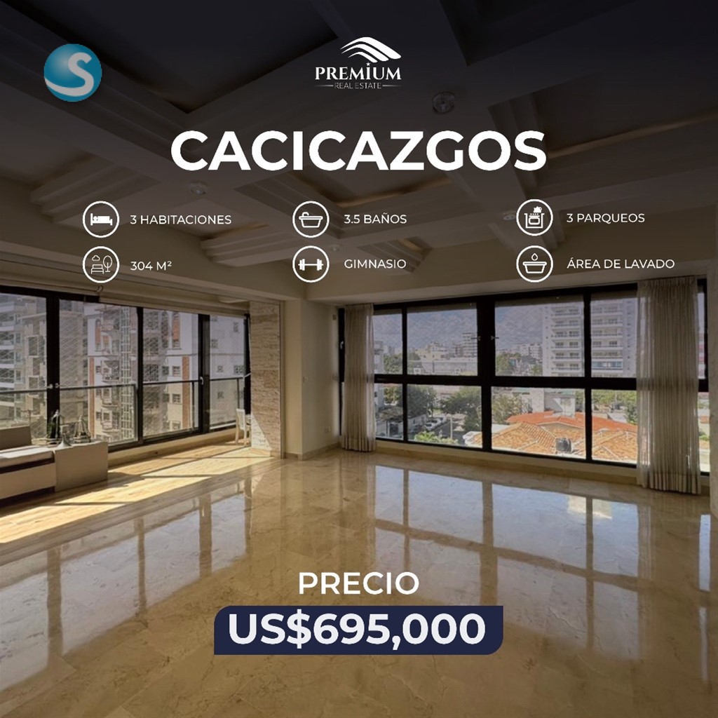 Cacicazgos 304 metros 5to piso 3 habitaciones 3.5 baños Estudio Estar familiar Cocina fría Cocina caliente Sala y comedor separados Balcón Pisos en mármol Área de lavado Cuarto de servicio con baño Escaleras de emergencia Shutter Aires independientes 3 parqueos techados paralelos Locker Lobby amueblado Gimnasio Seguridad 24/7 Planta full Gas común Precio US$695,000 Mantenimiento RD$22,000