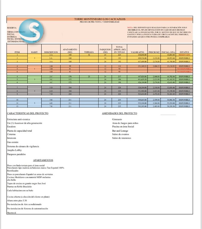 Agente Mayka Estrella Contacto: 849-856-5217 Propiedad: Apartamento Sector: Los Cacicazgos Metraje: Desde 167.9 m2 Parqueos: 2 Precio de Venta: Desde US$231,349 MONTENEGRO TOWER II - APARTAMENTOS EN LOS CACICAZGOS Torre de 6 niveles y 15 apartamentos ubicado próximo a la Ave. Anacaona cerca de los bancos más importantes, selectos restaurantes, el impresionante Parque Mirador Sur y centros comerciales de renombre, este lugar representa lo mejor de Santo Domingo. Vive en el corazón de la ciudad, donde cada día está lleno de posibilidades y facilidades, en un ambiente totalmente familiar. CARACTERÍSTICAS DE LOS APARTAMENTOS: - 3 Habitaciones - 3.5 baños - Sala - Comedor - Cocina - Balcón - Cuarto de servicio (si aplica) - Sala de estar (si aplica) - Desde 167.9 m2 - 2 parqueos TERMINACIONES: - Altura de entrepiso 3.30 - Puertas en Roble Brasileño - Cada habitación con su baño - Cocina abierta (a elección del cliente) - Pre-instalación de aire acondicionado - Pisos con linda textura para el área social - Topes de cocina en granito negro San José - Pre-instalación de sistema de automatización - Pisos en porcelanato Español en áreas de servicios - Cocinas Modulares con material MDF Melanina alto brillo AMENIDADES DEL PROYECTO: - Escalera - Cisterna - Ascensor de última generación - Gimnasio - Intercom - Gas común - Amplio Lobby - Bar and Lounge - Salón de eventos - Salón de reuniones - Parqueos paralelos - Planta de capacidad total - Sistema de cámaras de vigilancia - Estructura anti-sísmica FORMA DE PAGO: - Reserva: US$5,000 - Firma contrato: 10% - Durante la construcción: 30% - Completivo: a la entrega 60% - Fecha de entrega: Diciembre 2026 ***PERO FIEL ES EL SEÑOR, QUE OS AFIRMARÁ Y GUARDARÁ DEL MAL***