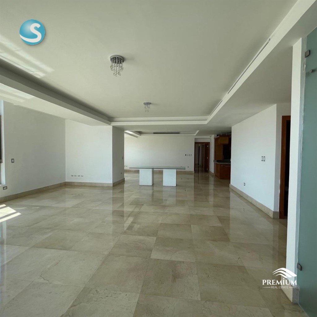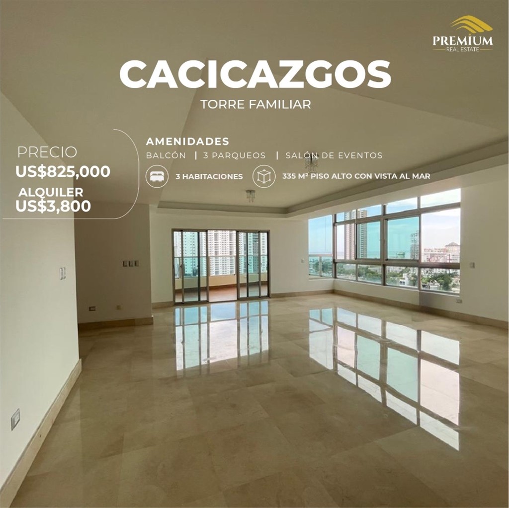 Los Cacicazgos, torre familiar, solo dos aptos por nivel. Piso alto con vista al mar 335 mts 3 habitaciones con walk-in-closet y baños Dormitorio principal con balcón, walk-in closet, baño con doble lavamanos y tope en mármol. Closet para ropa blanca Medio baños para visitas Recibidor Estudio Balcón Sala Cocina fría con desayunador Cocina caliente Comedor Cuarto de servicio con su baño Área de lavado 3 parqueos techados Amenidades de la Torre: 2 ascensores Salón de eventos con terraza destechada Gimnasio Sauna Lobby climatizado Seguridad 24/7 Precio de Venta: US$825,000 Precio de Alquiler: US$3,800