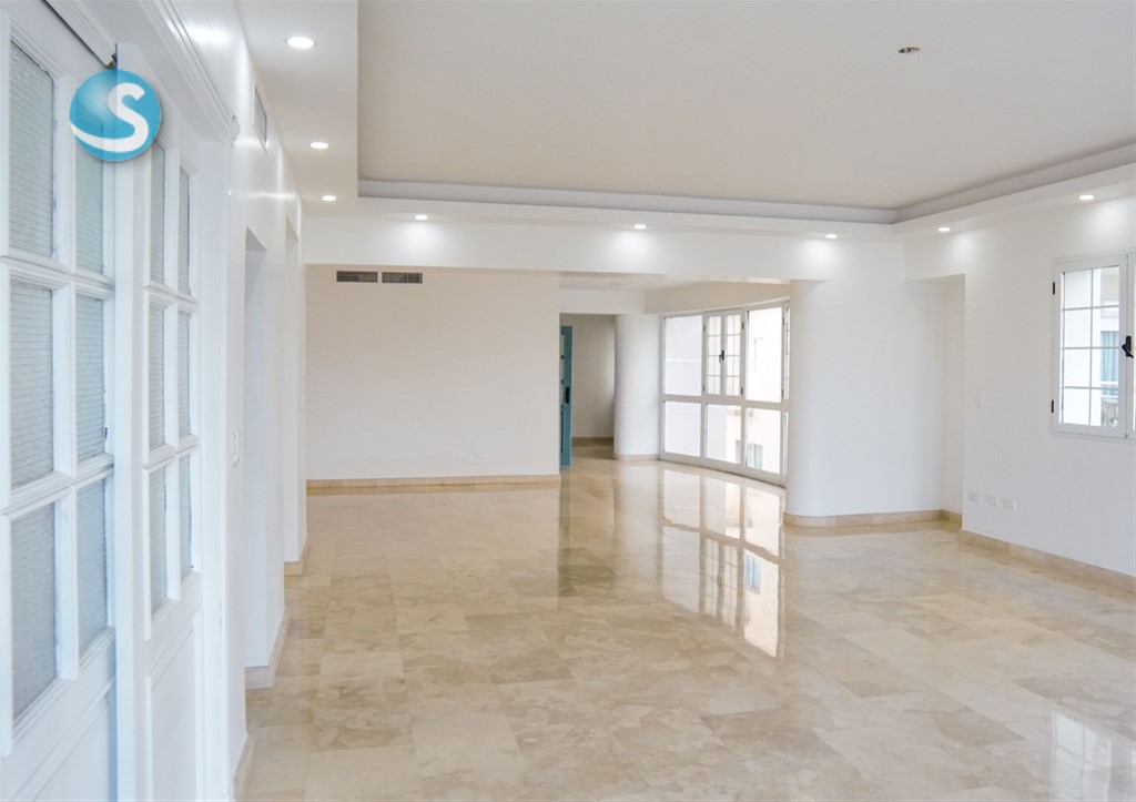 Los Cacicazgos, Torre familiar 300mts 4to nivel 3 habitaciones (cada una con baño y W/C) Mirador en dos de las habitaciones Medio baño para visitas Estudio Doble Sala Comedor Cocina fría Cocina caliente Habitación de servicio con baño Área de lavado Aire Central 2 parqueos paralelos Amenidades de la torre; Lobby Gas común 2 Ascensores Ascensor de carga Área para choferes Precio de venta: US$450,000 Mantenimiento; RD$20,100