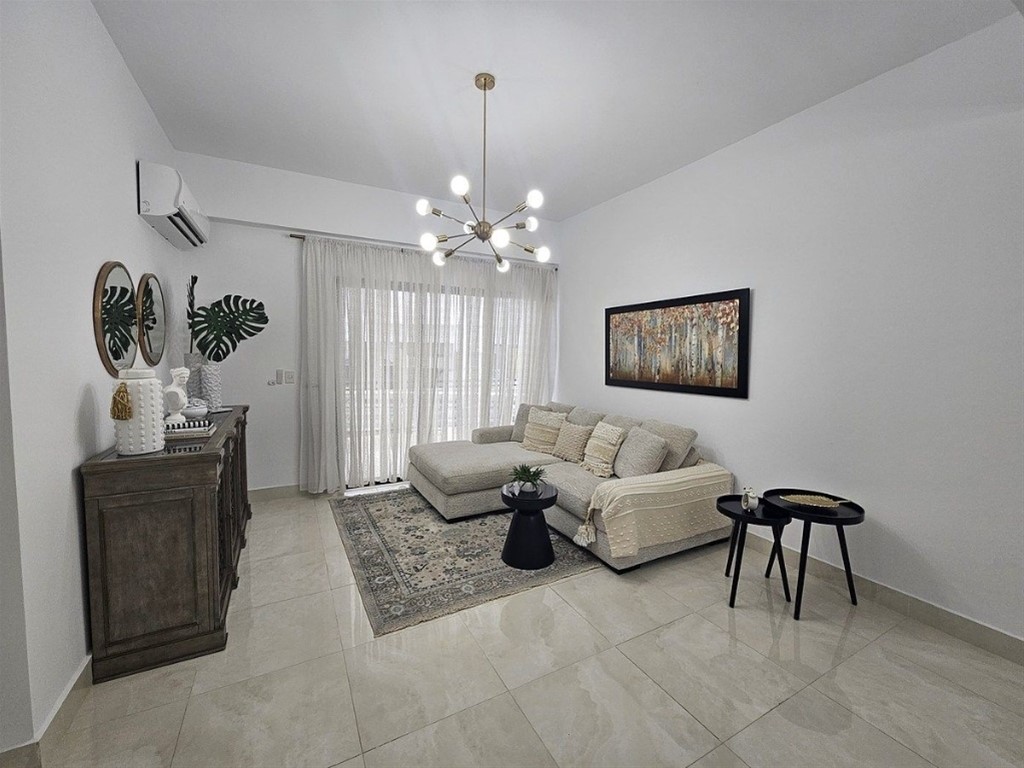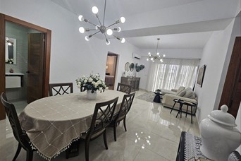 Moderno apartamento amueblado en venta o alquiler en Los cacicazgos 122 metros 2 habitaciones con sus baños Baño visitas Sala Comedor Balcón Cocina con desayunador Area lavado Habitación servicio con baño 2 parqueos paralelos Shutters Area social: Piscina Gimnasio Area juego niños Salon a actividades Sauna Terraza con BBQ Precio alquiler amueblado US$1,800 Precio venta con línea blanca y aires US$285,000