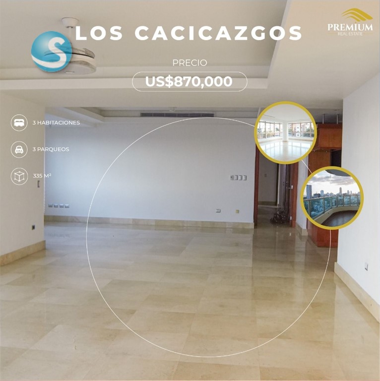 Los Cacicazgos, torre familiar, solo dos aptos por nivel. Piso alto con vista al mar 335 mts 3 habitaciones con walk-in-closet y baños Dormitorio principal con balcón, walk-in closet, baño con doble lavamanos y tope en mármol. Closet para ropa blanca Medio baños para visitas Recibidor Estudio Balcón Sala Cocina fría con desayunador Cocina caliente Comedor Cuarto de servicio con su baño Área de lavado 3 parqueos techados Amenidades de la Torre: 2 ascensores Salón de eventos con terraza destechada Gimnasio Sauna Lobby climatizado Seguridad 24/7 Precio de Venta: US$870,000 Precio de Alquiler: US$3,800