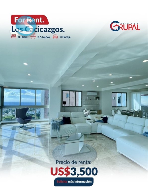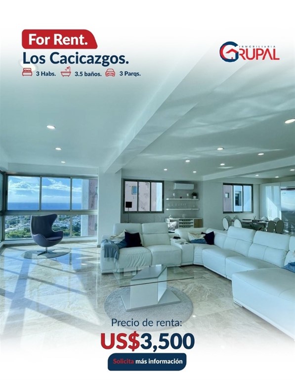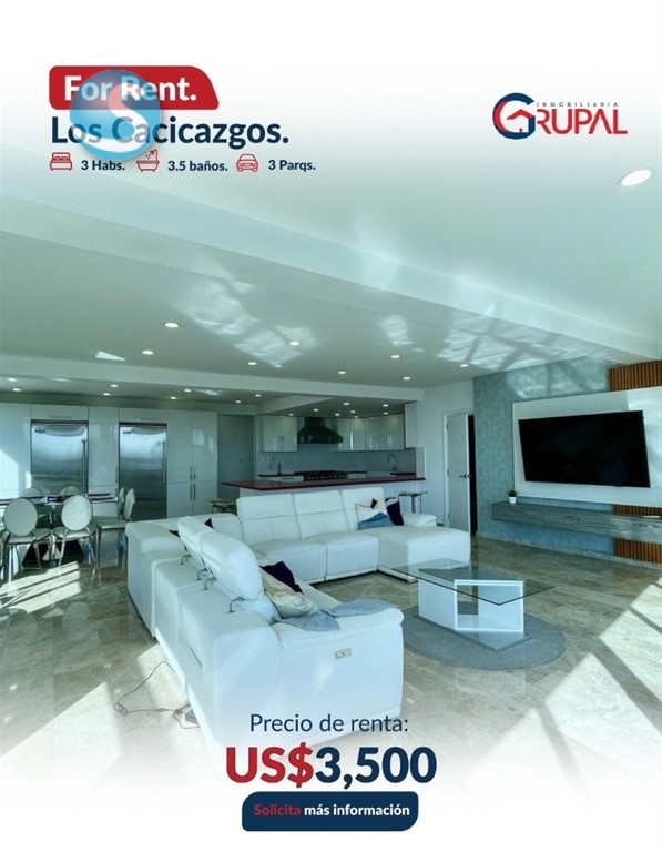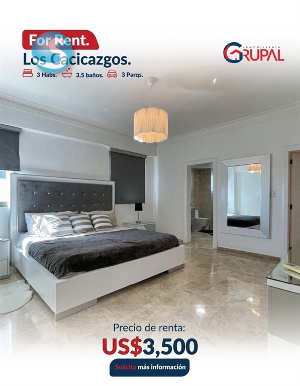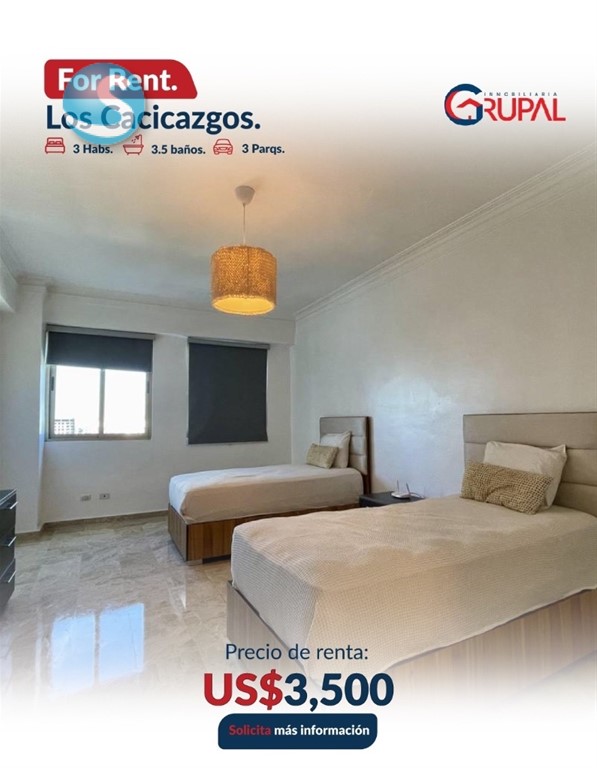 Amplio apartamento en exclusivo sector de Los Cacicazgos?? ?????????????????????????????? ?????? ?????????????????? ??3 habitaciones con WC ??3.5 baños ??Sala ??Comedor ??Desayunador ??Cocina ??Área de lavado ??Habitación de servicio ??3 parqueos paralelos y techados ?????????????????????????????? ?? ???????????????????? ???? ???? ?????????? ??Portón eléctrico ??3 ascensores ??Luz 24 hrs ??Cámaras de seguridad ??Planta full ??Área de juegos ??Gimnasio ??Piscina ??Salón Multiuso ??Lobby climatizado ??Terraza común ??Gas común ??Pozo ??Cisterna ???????????? ???? ???????????????? US$3,500???? ??