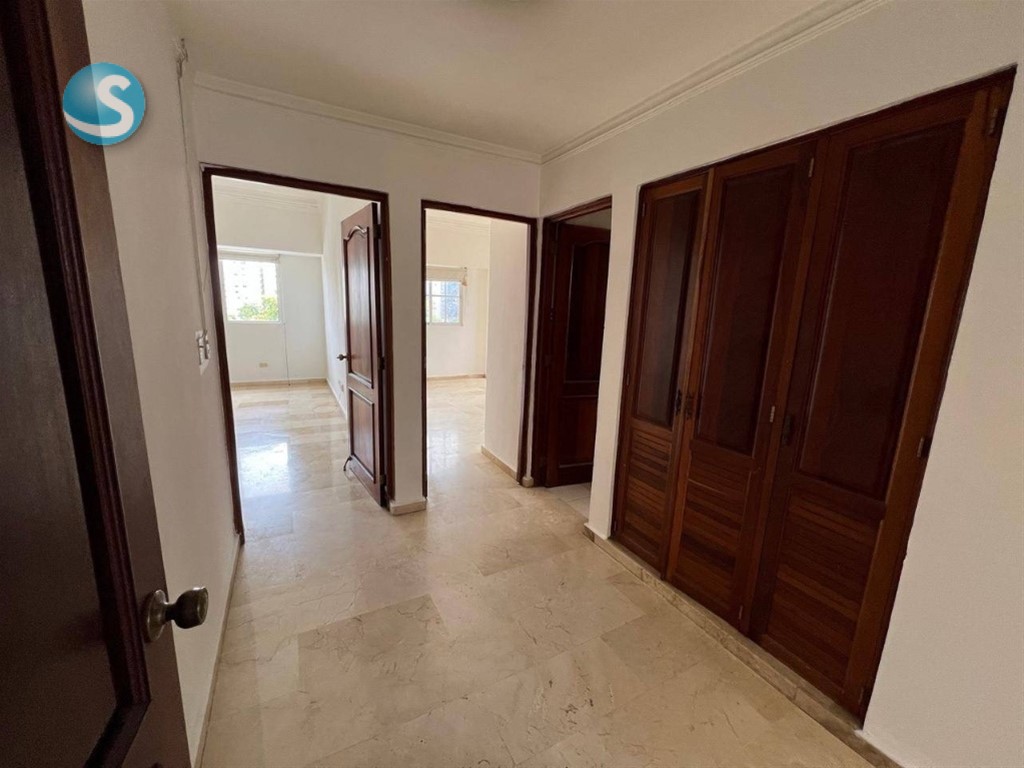 Los Cacicazgos | Apartamento clásico con vista al mar, a pasos del Mirador Sur Amplio y cómodo apartamento ideal para quienes valoran espacios generosos, ubicación privilegiada y un estilo clásico en una de las zonas más exclusivas de la ciudad. Características del apartamento: 210 m² 7mo nivel 3 habitaciones 2.5 baños Sala Comedor Family room Balcón con vista al mar Cuarto de servicio 2 parqueos Paralelos 3 aires acondicionados Abanicos Torre de 7 niveles con: Lobby Ascensor Solo 2 apartamentos por piso Parqueos techados Precio: US$1,350 (mantenimiento incluido)