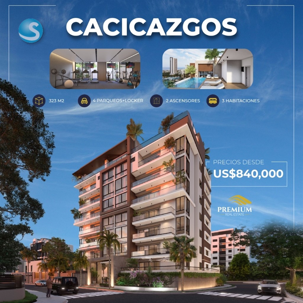 Sólo 3 Unidades Disponibles CACICAZGOS 323 m2 3 Habitaciones con baños y Walk-in closets 3.5 Baños Sala Estudio Comedor Cocinas Fría y Caliente con topes en cuarzo y granito Pisos y revestimientos en Mármol Aires de VRF alta eficiencia, Incluidos en: (Habitaciones, Sala, Estudio, Comedor y Cocina Fría) 2 Ascensores 4 Parqueos + Locker Área Social Infinity Pool Lobby Climatizado Gimnasio Área de niños Área de Masajes Sauna Terraza techada y destechada BBQ Estar de Choferes Desde: US$840,000 (Entrega Dic. 2026)