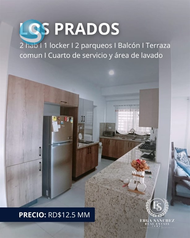 Apartamento en venta en Los Prados – Residencial familiar Un espacio completo, funcional y con una ubicación que nunca falla. CARACTERISTICAS: 2 habitaciones, cada una con su baño (principal con walk-in closet) Baño de visitas Sala y comedor Balcón Cocina modular en roble con desayunador Cuarto de servicio con baño Closet de ropa blanca amplio Área de lavado Preinstalación de aire acondicionado 2 parqueos techados lineales 1 locker Pisos en porcelanato AMENIDADES: Terraza común y salón de actividades en el 6.?? piso Lobby climatizado Planta eléctrica full Ascensor de última generación Gas común con medidor Cámaras de seguridad Sistema contra incendios PRECIO: RD$12.5 MM #KL