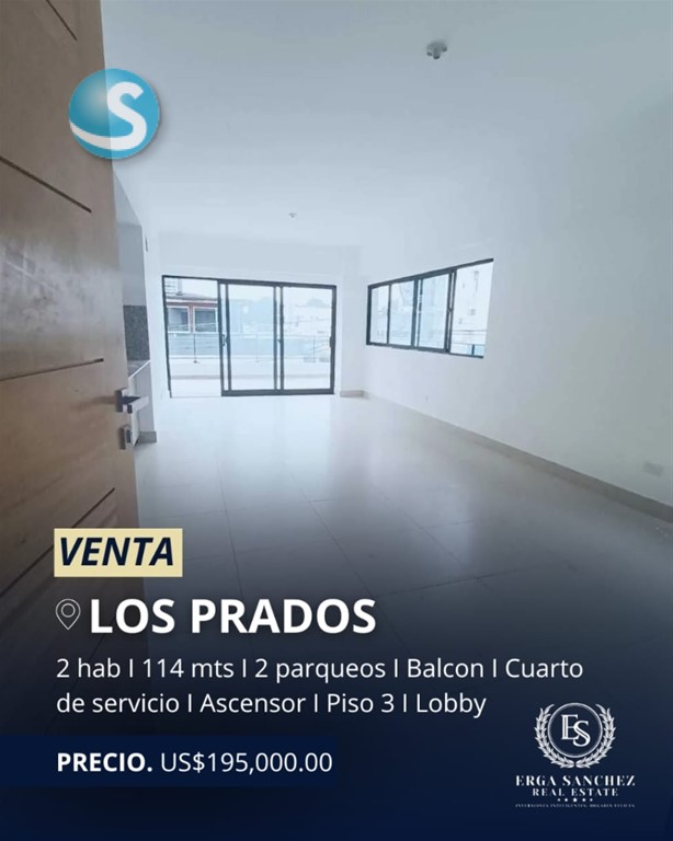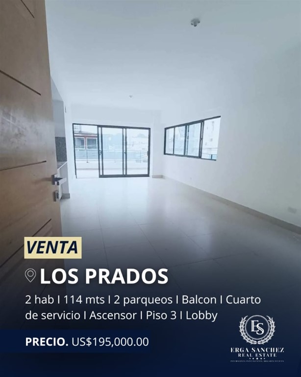 A ESTRENAR! hermoso apartamento 3er piso con balcón en??Los Prados / REBAJADO Un apartamento amplio, luminoso y moderno. Ubicado en área residencial cerca de todo CARACTERÍSTICAS Y AMENIDADES: 114 mts2 3er piso con ascensor 2 habitaciones cada una con su baño y closets en madera preciosa La habitación principal con balcón 1/2 baño de visita Cocina modular moderna Sala - comedor con mucha luz natural y balcón Cuarto de servicio con su baño Área de lavado Calentador a gas incluido Todas las puertas en madera preciosa, pisos y cerámicas importados 2 parqueos paralelos y techados Ascensor Seguridad 24/7 Cámaras en áreas comunes Lobby Planta full Gas común con medidor PRECIO: US$195,000.00 #KL