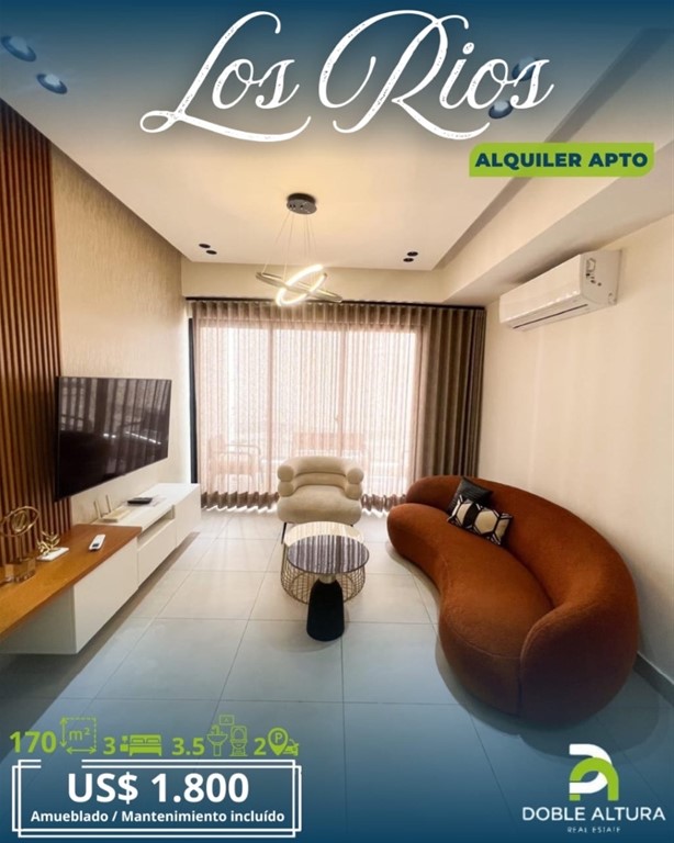 Apartamento amueblado full de 3 habitaciones en lo mejor de Los Ríos ??Próximo a Intec, con gym, terraza, vista despejada?? Torre nueva, próximo a al bravo de los Próceres ? Precio Alquiler Amueblado: US$1,800 Mantenimiento incluido Características: -170Mts nivel 5 -3 habitaciones c/u con baño y walk-in closet -Habitación principal con Balcón privado -3.5 baños -Baño de visitas -Cocina con desayunador -Sala amplia -Balcón frontal con vista despejada -Closet de ropa blanca -Área de lavado -Habitación de servicio con baño -2 parqueos paralelos -Cerradura inteligente -Decorado finamente Amenidades de la Torre: -Lobby climatizado -Planta full -Ascensor -Área social -2 Jacuzzis -Terraza -Bar -Gimnasio -Portón eléctrico -Intercom -Seguridad 24/h