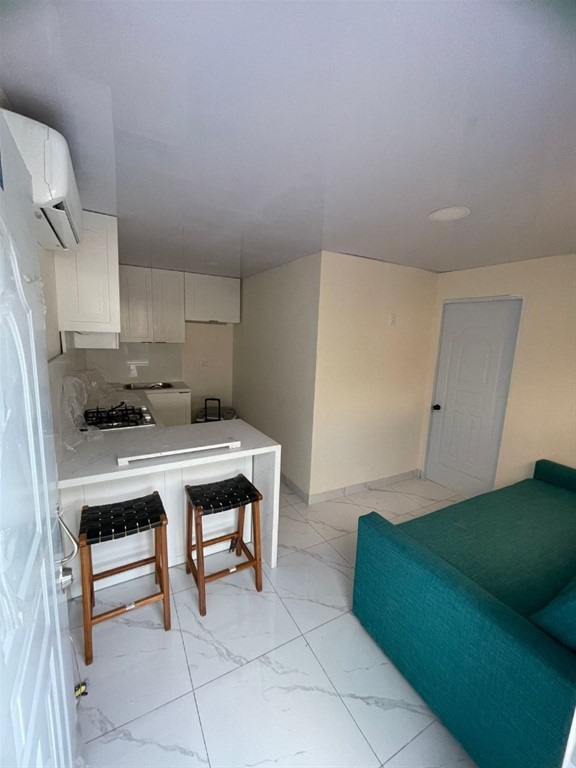 4to piso Entrada con token Apartamento estudio amueblado para estrenar, nuevo todo! Cocina con tope de cuarzo blanco Habitación separada con su baño Cama de 2 plazas Gavetero Sofá cama en área de sala-cocina Aire acondicionado Estufa empotrada de 4 hornillas Sillas para desayunador Grifería importada. Pisos en porcelanato Posibilidad de parqueo en la calle. Urbanización cerrada con Garita de seguridad NO SE ACEPTAN ANIMALES/MASCOTAS