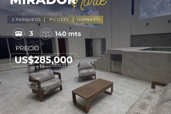 Mirador Norte A metros de Downtown Center, Solo 12 familias Terraza Picuzzi Gimnasio Área de BBQ 3 Habitaciones 126 y 140 mts 3.5 Baños Sala Comedor Cocina Área de lavado Cuarto de servicio Family Room *En unidades de 140 metros* 2 Parqueos Entrega en 24 meses Desde: US$285000 Forma de pago: -Reserva con: US$5,000 -Separación 10% -Inicial 40% -Contra entrega 50%