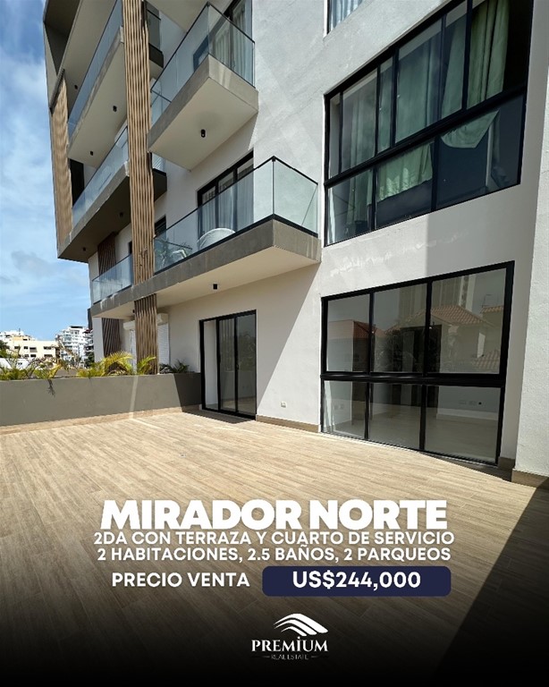 Apartamentos en venta 2da con terraza en Mirador Norte Nuevo a estrenar 98 m2 neto de apartamento + 40 m2 de terraza 2 habitaciones con baño y Walk-In Closet 2 parqueos lineales Cocina con desayunador Baño de visita Cuarto de servicio Closet de ropa Blanca Caracteristicas generales: Ascensor Lobby BBQ Gimnasio Jacuzzi Terraza destechada Gas común, planta eléctrica full