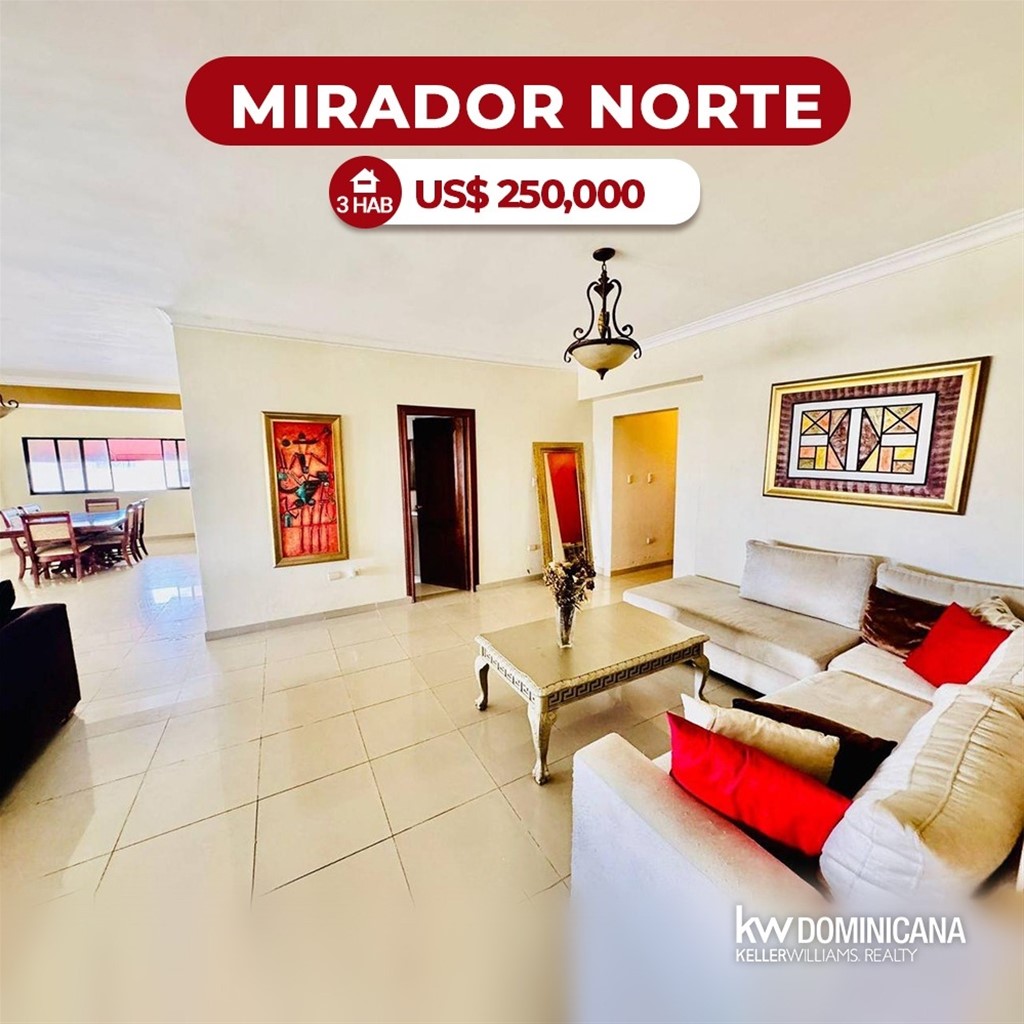 Amplio apartamento en venta | Mirador Norte Espacio, confort y ubicación se unen en este espectacular apartamento ideal para familias que buscan amplitud y calidad de vida en un entorno residencial tranquilo. Detalles del apartamento: • 207.76 m² de construcción • 3 habitaciones, cada una con walk-in closet (principal forrado en cedro) • 3.5 baños • Sala y comedor espaciosos • Balcón amplio • Ascensor • 2 parqueos techados • Espacio adicional para jet ski o motor Mantenimiento RD$6,800 (incluye gas) Precio de venta: US$250,000 Una excelente oportunidad para vivir con comodidad, privacidad y excelente distribución en Mirador Norte. Escríbenos por DM para más información Sugeiley Ozuna 809-885-0795 Kw Capital
