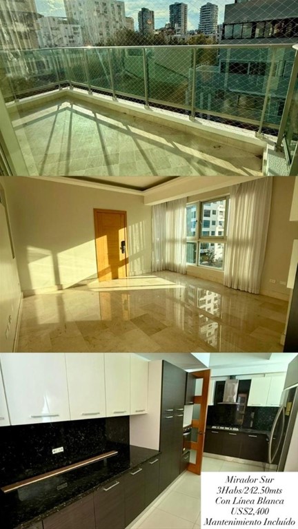 Alquilo apartamento en el piso 4 en Mirador Sur. •Línea blanca completa •Aires acondicionados inverter en la sala y habitaciones (total de 4) •3 habitaciones •2 balcones •3.5 baños •1 cuarto de servicio •1 cocina cerrada •Gym •Lobby •1 Locker •2 Parqueos paralelos •272.78 m2 con parqueos incluidos •242.50 m2 netos •US$2,400 , mantenimiento incluido