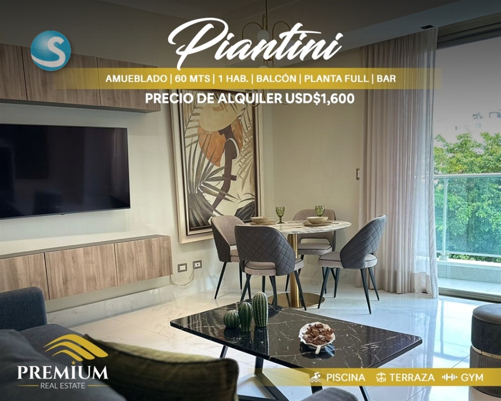 Piantini Alquilo apto amueblado 4to Nivel 1 Habitación 1.5 Baños Sala-Comedor Balcón Cocina Área de lavado 1 Parqueo techado 4 Ascensores Lobby climatizado Piscina Gym Área de niños Terraza Área de bbq Lounge Salón multi-usos Alquiler Amueblado:US$1,600