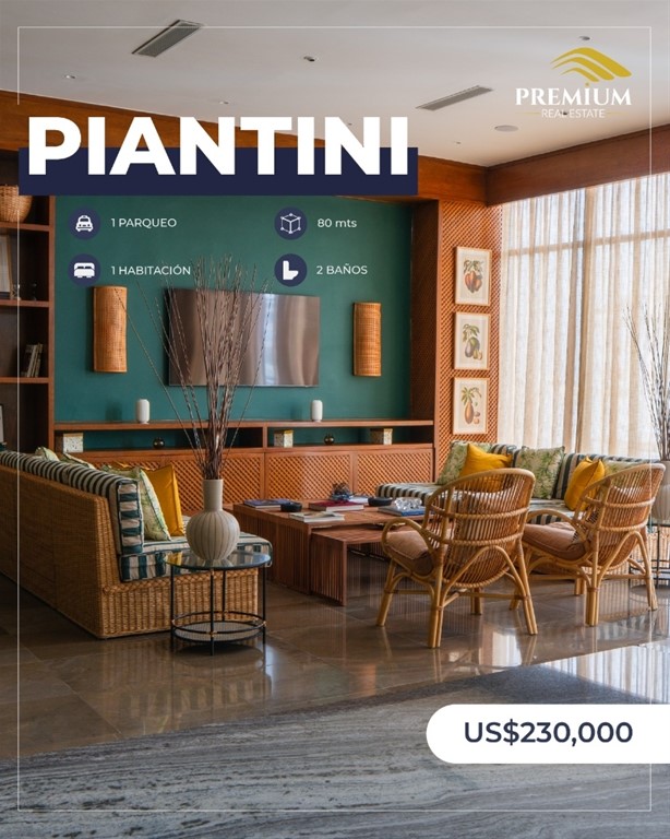 PIANTINI Línea blanca incluida 80 mts 1 Habitación 2 Baños Sala Comedor Área de lavado Balcón 1 Parqueo La torre cuenta con: 2 Picuzzi Gimnasio Salón de eventos Terraza BBQ Solárium Área infantil Lobby de lujo Venta: US$230,000