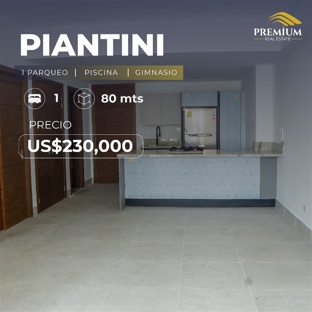 PIANTINI Línea blanca incluida 80 mts 1 Habitación 2 Baños Sala Comedor Área de lavado Balcón 1 Parqueo La torre cuenta con: 2 Picuzzi Gimnasio Salón de eventos Terraza BBQ Solárium Área infantil Lobby de lujo Venta: US$230,000