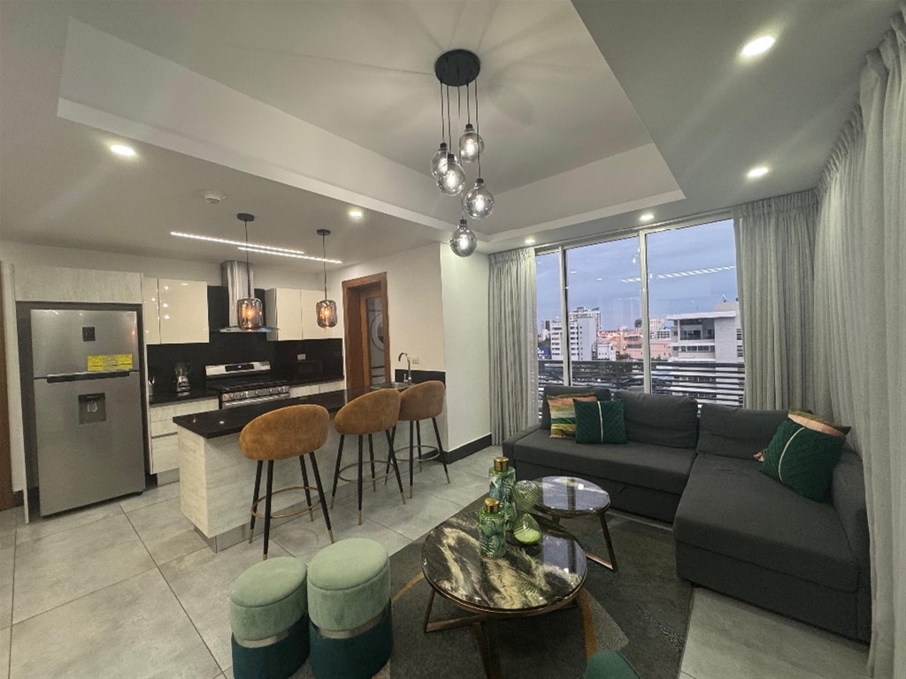 Piantini Amueblado full 80 Metros Balcón con vista a la cuidad 1 Hab 1.5 Baños Sala Cocina Comedor 1 Parqueo Amenidades Terraza Bbq Gym Jacuzzi Piscina Sauna Sala de estar Lobby Precio de Alquiler Amueblado US$1,200
