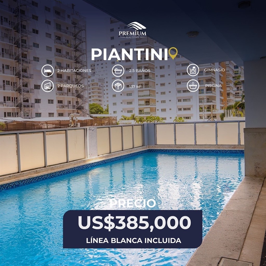 Apartamento en venta, ubicado en Piantini Piso 14 137 mts 2 Habitaciones 2.5 Baños Sala Comedor Cocina Estar Balcón tipo terraza Cuarto de servicio con su baño Área de Lavado 2 Parqueos Torre con áreas sociales: Kitchenette Piscina Jacuzzi Gimnasio Sauna caballeros Sauna para damas Lobby 4 Ascensores Venta: US$385,000 (Línea Blanca incluida)