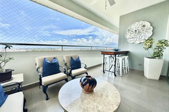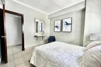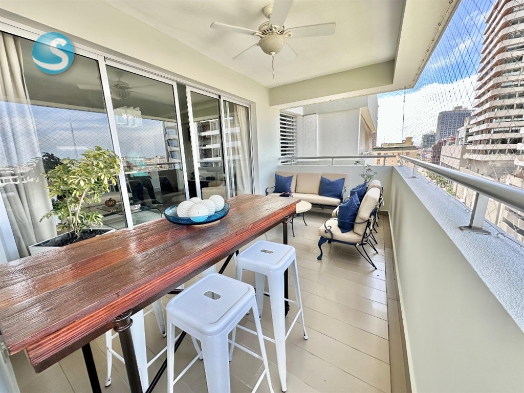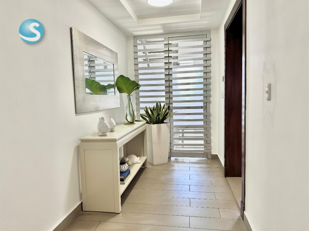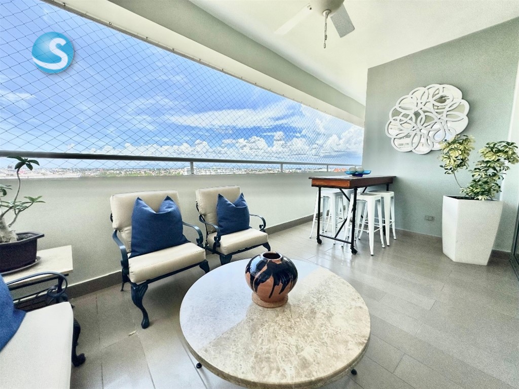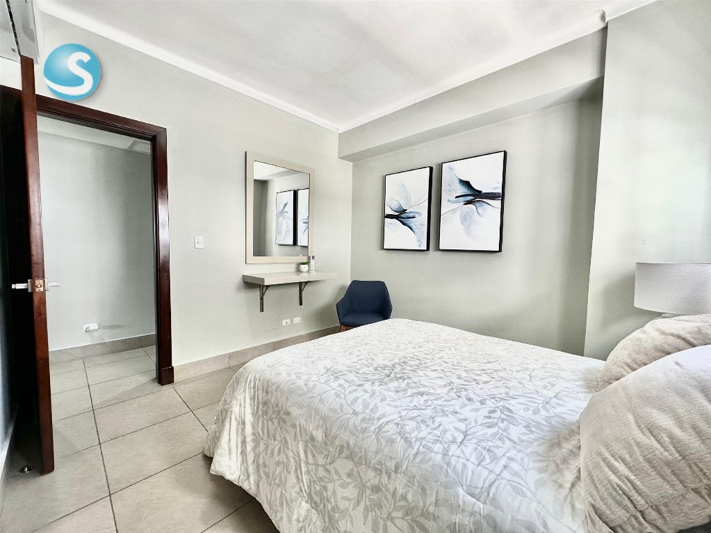 Apto amueblado a solo pasos de Blue Mall. 3 hab 3.5 baños Sala Comedor Cocina Balcón tipo terraza Área de lavado Cuarto de servicio 2 parqueos Recibidor Amenidades de la torre: Lobby 2 ascensores Gimnasio Piscina Terraza techada Estación de choferes 2 aptos por piso Mantenimiento y gas incluido