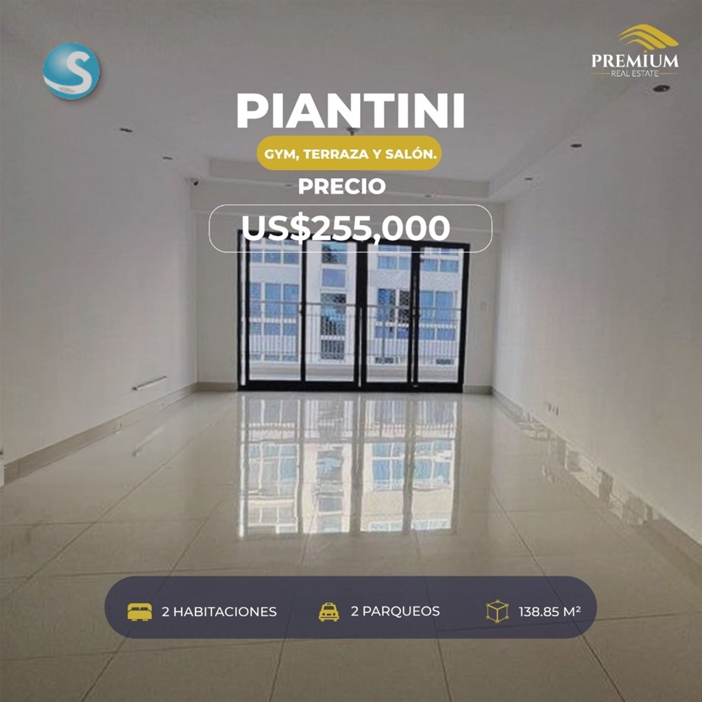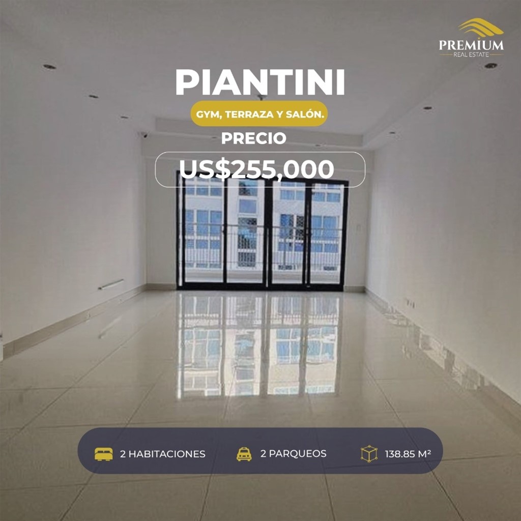 Piantini 2 habitaciones 2.5 baños Cuarto de servicio Balcón Área de lavado Sala Cocina Comedor 2 parqueos lineales 138,85 mt2 Nivel alto Gym Terraza descubierta Salón cerrado Precio de Venta US$255,000 Mantenimiento RD$ 9,110, incluye gas!