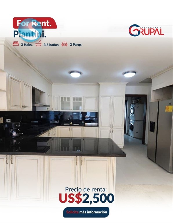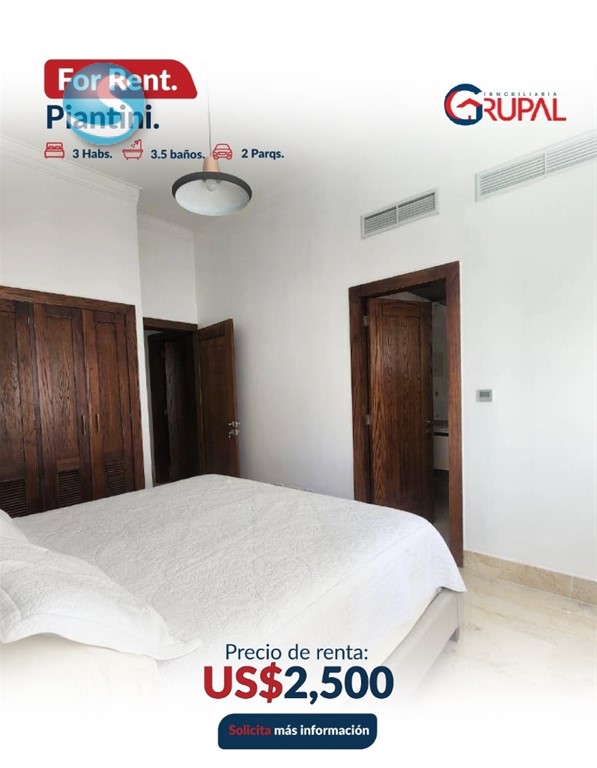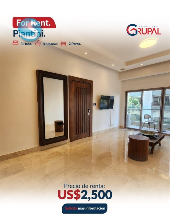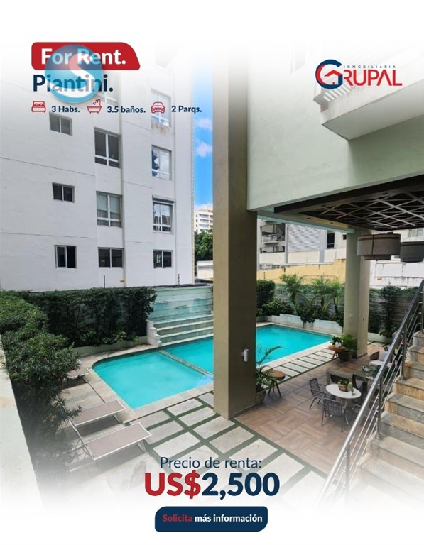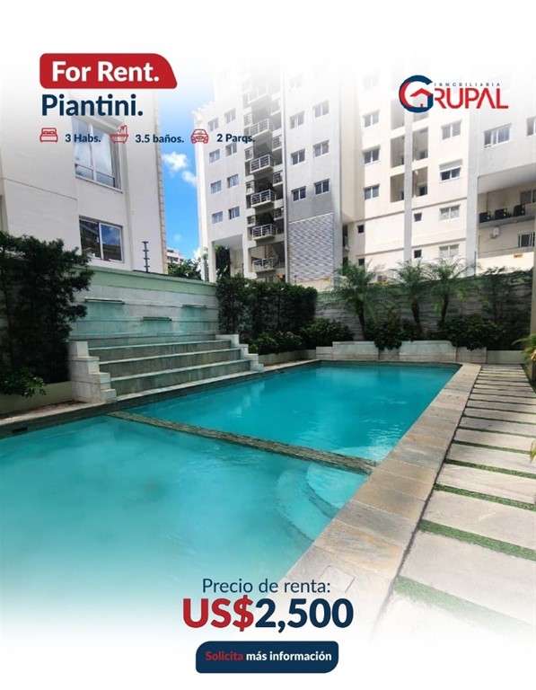 Exclusiva propiedad, ubicada a pasos de Blue Mall y del World Trade Center Santo Domingo - Piantini?? ?????????????????????????????? ?????? ?????????????????????? ?2 parqueos techados en los sótanos 2 y 4 ?Balcón frontal a la calle ?Salón abierto para sala y comedor ?Baño de visita ?3 Habitaciones con sus baños (principal con walk-in closet) ?Cocina fría integrada con desayunador ?Cocina caliente cerrada ?Cuarto de servicio con baño ?Se entrega Amueblado ?Aire central en habitaciones + Split en sala y comedor ?????????????????????????????? ?? ???????????????????? ???? ???? ?????????? ??Piscina ??Terrazas amuebladas ??Salón de actividades ??Gimnasio ??Cancha de Squash ??Área de niños ??Área para jogging ??Lobby amueblado con vigilancia 24 horas ??Baños sociales con ducha y sauna ??Cuatro (4) elevadores (1 de carga + 3 principales con acceso personalizado) ??Generador eléctrico ??Gas común con medidor ??Escaleras de emergencias internas ??Cerradura digital ???????????? ???? ???????????????? US$2,500 ? Información: ?809-454-7240 Carlos Tejeda