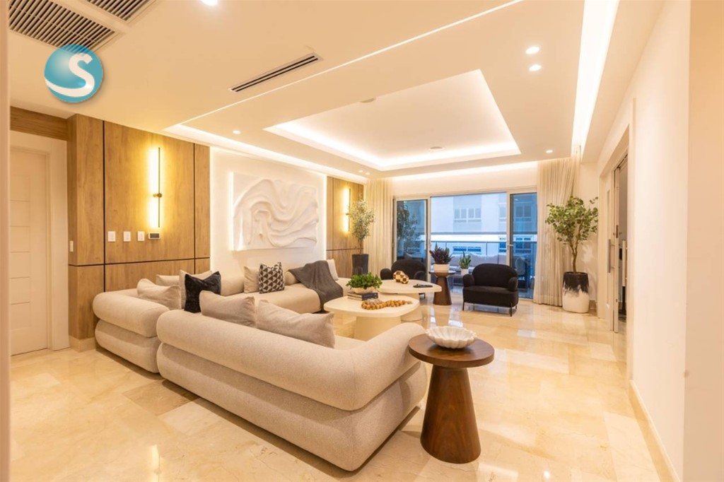 Apartamento en Venta en Piantini Ubicado en una torre moderna y completa, este espacio combina elegancia, amplitud y confort. Cuenta con: 271 m² netos de apartamento 342 m² totales 3 habitaciones, cada una con su baño y walk-in closet Baño de visitas Estudio Recibidor, sala y comedor formal Balcón con vista abierta Área familiar o de estar Cocina fría moderna y cocina caliente Área de lavado 4 parqueos + 2 lockers Entre sus mejoras destacan shutters, cámaras de seguridad, aires inverter en todas las áreas, ventanas antiruido, pisos de mármol y madera, techos trabajados, iluminación moderna, puertas en roble, cerraduras inteligentes y sistema de bocinas integradas en las áreas sociales. La torre ofrece un amplio lobby amueblado y climatizado, gimnasio, piscina, terraza, área infantil, salón de eventos, conserjería 24/7 y salón para choferes. Precio: US$890,000