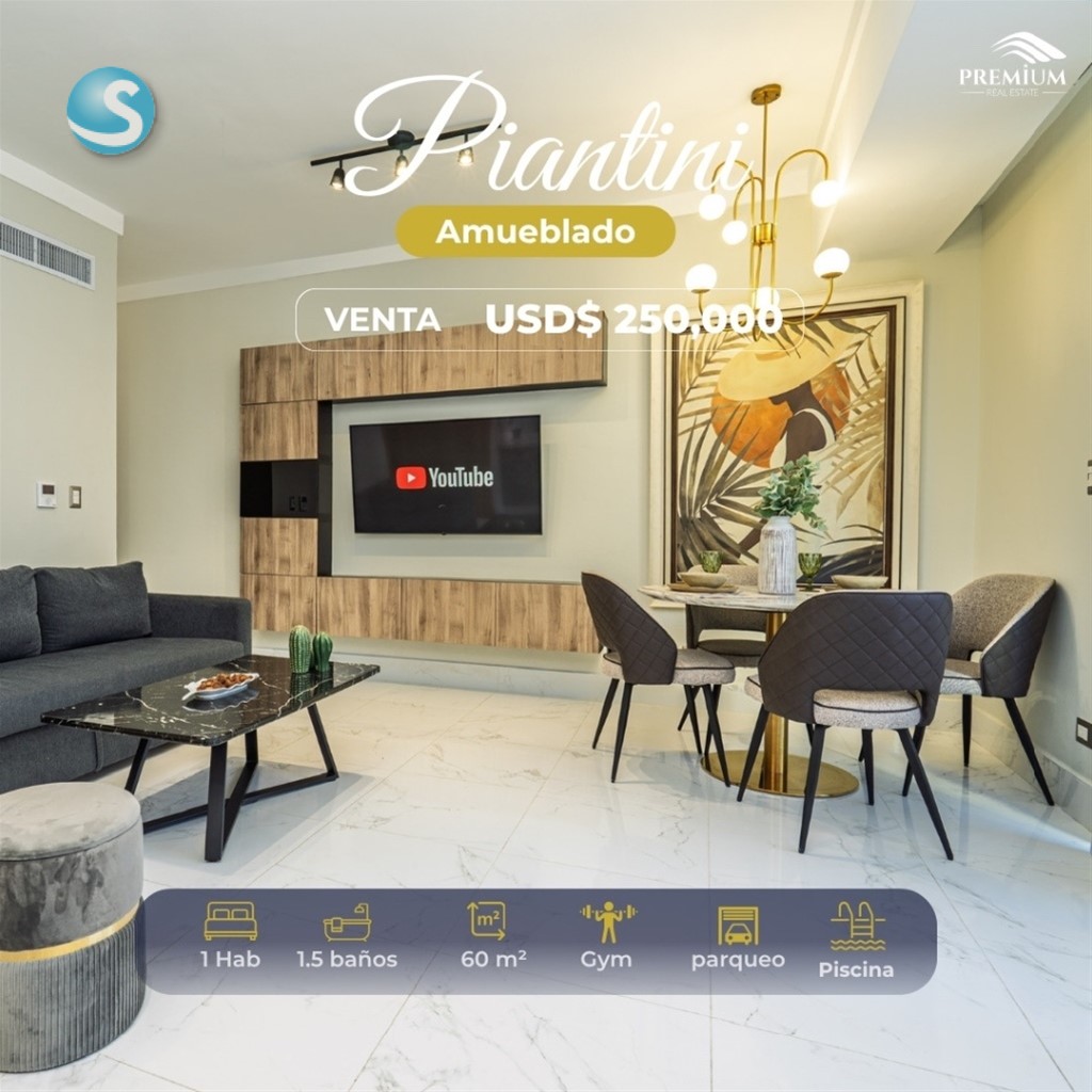 Piantini Amueblado en Piantini Piso 4 Metros 60 Una habitación con su baño y Walking Closet Sala Medio baño Comedor Cocina Balcón Amplio Área de lavado equipado Planta full Seguridad 24/ horas 2- Ascensores Piscina Gimnasio Terraza Bar Alquiler USD$1,500 Venta USD$250,000