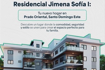 RESIDENCIAL JIMENA SOFIA I Prado Oriental, San Isidro, Santo Domingo Este Exclusivo Proyecto De 12 Apartamentos de 3 Habitaciones Vive como mereces, en un proyecto moderno, cómodo y pensado para tu bienestar. Descubre estos modernos y amplios apartamentos: Áreas comunes y seguridad: * Área social techada y destechada con BBQ y jacuzzi. * Control de acceso por token e intercom. * Portones eléctricos. * Garita de seguridad. Distribución general: * 3 dormitorios, principal con walk-in closet y baño privado. * Sala - Comedor. * Cocina modular con tope en granito. * 2.5 baños. * Closet de ropa blanca. * Cuarto de servicio con baño. * Área de lavado. * 1 o 2 parqueos por unidad. * Balcón amplio. * Patio privado (1er piso). * Terraza privada (4to piso). Acabados y terminaciones: * Puertas en madera preciosa. * Piso de porcelanato importado. * Techos y paredes terminados en yeso y estuco. * Barandas de aluminio y cristal. * Ventanas corredizas aluminio P65 / puertas corredizas aluminio P92. Preinstalaciones y servicios: * Tinaco y calentador. * Aires acondicionados. * Jacuzzi en áreas privadas. * Sistema de gas común. * Sistema de abastecimiento silencioso. * Respaldo de agua por pozo y bomba sumergible. Desde 99.15 m² – hasta 172.40 m² Ubicación privilegiada. Diseño moderno. Seguridad garantizada. Precios Desde: US$116,300 Plan De Pago Reserva: US$1,000 Firma contrato: 10% Durante construcción: 20% Financiamiento: 70% ?? Fecha De Entrega: Julio 2027 ! Tu nuevo hogar te espera ¡ ¡Contáctanos! (849) 214 3466 / (829) 659 7234 [email protected]