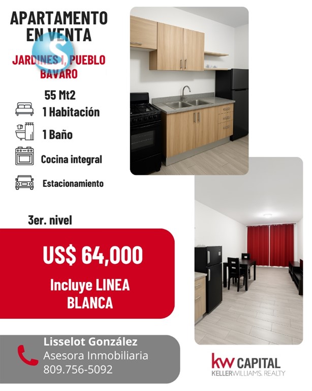 ¡Oportunidad de inversión en Jardines de Pueblo Bávaro! 1 Hab (55 m²) + 1 parqueo + línea blanca | 3er piso Anuncio (listo para publicar): ?? Jardines de Pueblo Bávaro Si buscas una propiedad ideal para invertir (renta larga o vacacional), esta es una excelente opción por su tamaño, ubicación y porque se entrega equipada. ? Apartamento 1 habitación ?? 55 m² ?? 3er piso ?? 1 parqueo ?? Incluye línea blanca: aire acondicionado, lavadora, TV, nevera, calentador de agua y estufa. ? Lo mejor para inversionistas: Se entrega listo para ponerlo a producir (sin compras iniciales fuertes). Formato 1 habitación: alta demanda para alquiler en la zona. Precio de alquiler mensual - opcion amueblado: US$500.00 mantenimiento incluido Excelente relación precio/metros/amenidades. ?? Escríbeme para precio, fotos y coordinar visita.