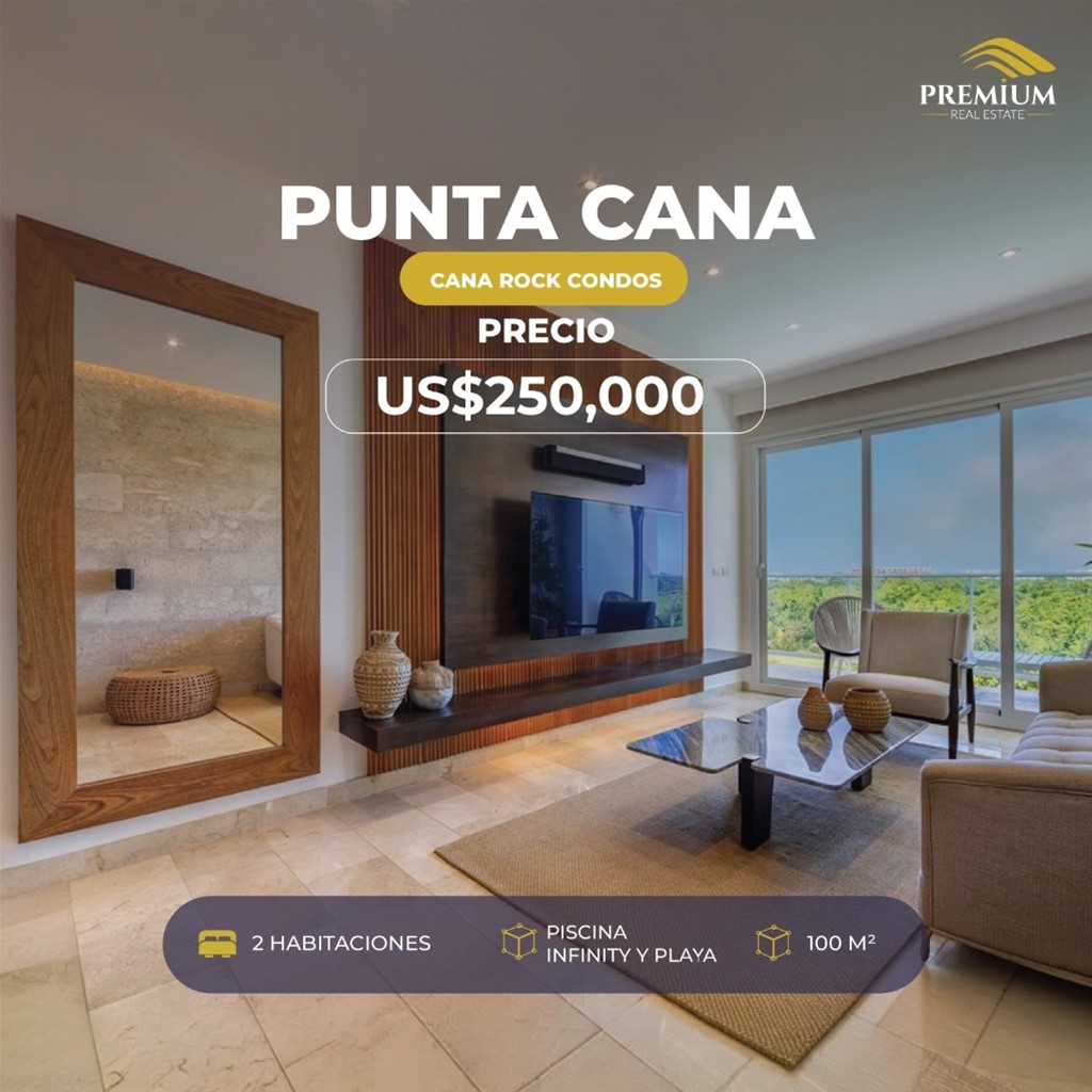 Cana rock condos ! ¡Apartamento amueblado! 2 habitaciones 2 baños Sala Comedor Cocina Balcón 100 mt2 Nivel medio Piscina infinity Campo de golf Cancha de tenis Club de playa Playa Confotur Precio de Venta US$250,000