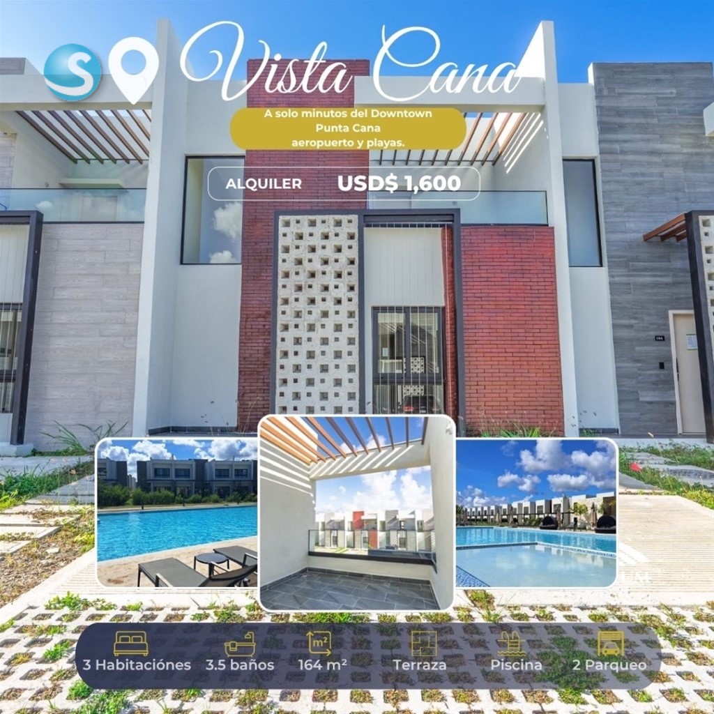 Townhouse Vista Cana | Punta Cana 164 m² 3 habitaciones 3.5 baños 2 parqueos Sala de doble altura con acceso directo a piscina Comedor Cocina moderna Clóset de ropa blanca Patio Terraza en 2do nivel ? Dentro de exclusivo residencial en Vista Cana: Casa club frente al lago Piscina para adultos y niños Acceso directo a amplia piscina desde la propiedad Gimnasio equipado Área infantil Más de 30 parqueos para visitantes Triple acceso al proyecto Seguridad y control de acceso 24/7 Zonas verdes y jardines ? Amenidades premium de Vista Cana: Playa artificial estilo resort Campo de golf nocturno de 9 hoyos Lagos para pesca deportiva Áreas de yoga al aire libre Rutas para bicicletas Senderos ecológicos y de jogging Restaurantes internacionales Espacios de coworking y negocios ? Ubicada estratégicamente en el corazón de Punta Cana, ideal para alquileres: 10 minutos del Aeropuerto de Punta Cana 15 minutos de Playa Bávaro Cerca de Downtown, plazas, bancos y supermercados ALQUILER: USD$1,600.00