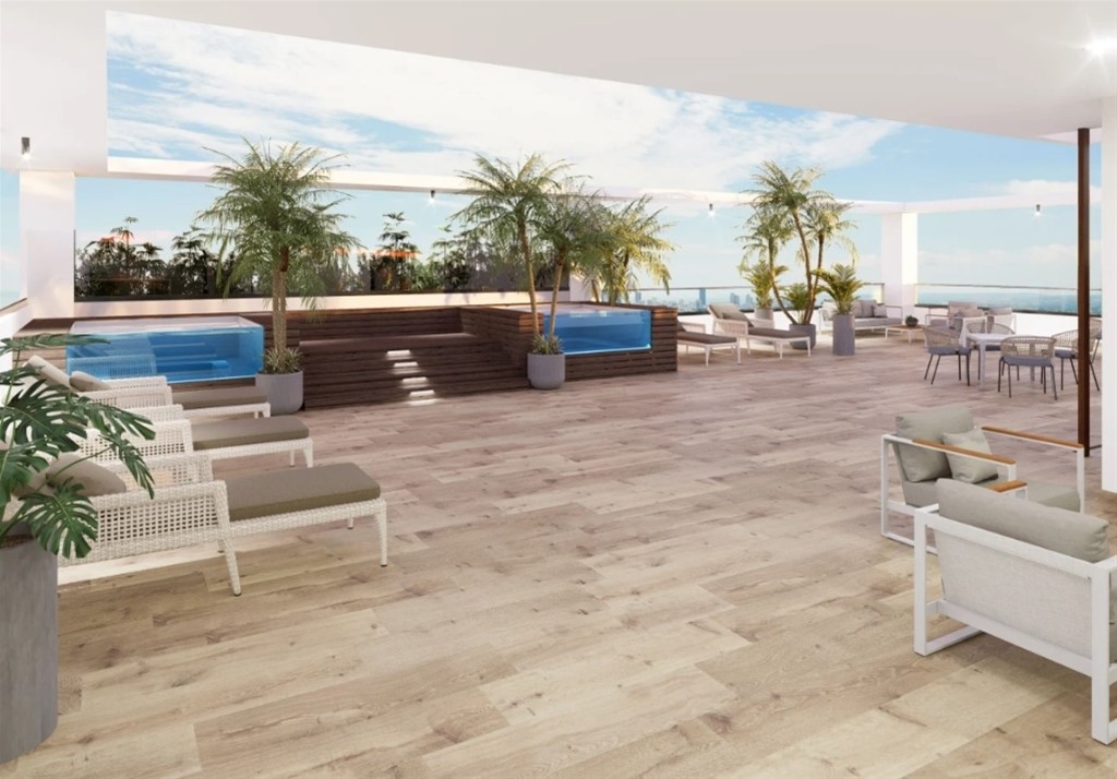 Características Generales • Lobby de entrada amueblado • Área social tipo Rooftop techada y destechada con 2 jacuzzi y bbq. • Área infantil • Gimnasio • Salón Lounge • Working Space • Ascensor de última generación • Planta full • Sistema de cámaras de seguridad • Pozo tubular • Gas común • Control de acceso • Sistema contra incendio Terminaciones: • Pisos en porcelanato • Cocinas modulares con desayunador • Tope de cocina en granito con backsplash • Puertas y closets en madera preciosa • Grifería importada • Muebles de baños • Pre-instalación de aires acondicionados en habitaciones • Calentador