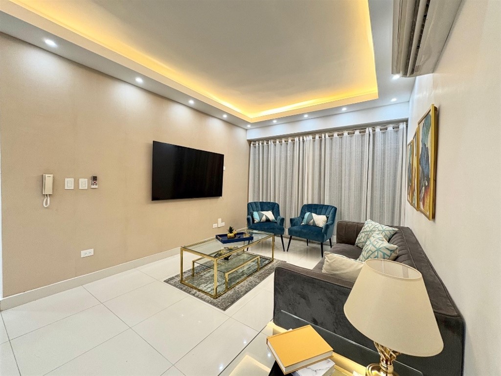 Coqueto apartamento en Renacimiento, Amueblado listo para mudarte, te queda cerca supermercados, farmacias, avenidas principales y el parque Mirador Sur 89.8 metros 1 Habitación w/closet y baño Baño para visitas Área de lavado Balcón Sala Cocina abierta con desayunador 1 parqueo Lobby amueblado Piscina Terraza amueblada Salón para eventos 2 Ascensores