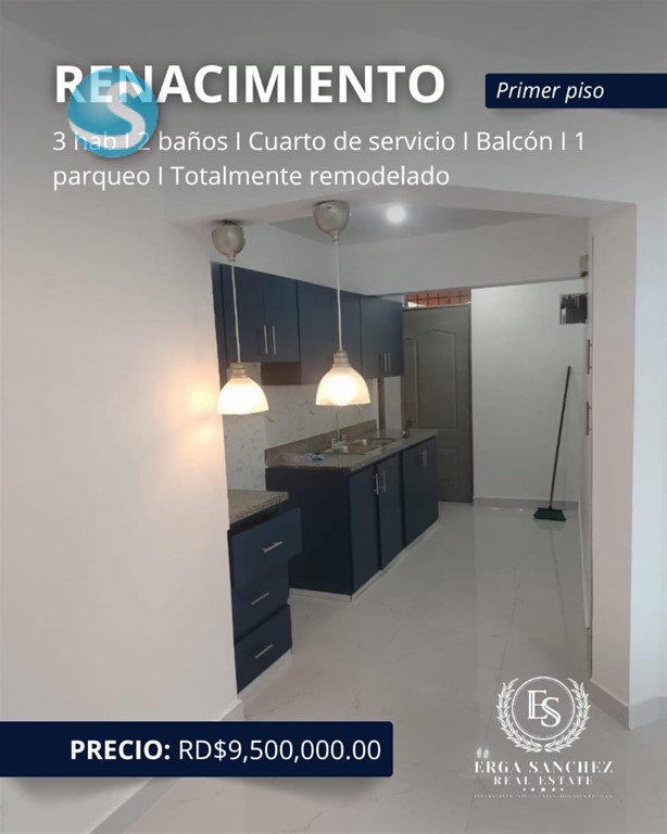 Apartamento en Primer Piso TOTALMENTE REMODELADO en Renacimiento Si estás buscando un apartamento cómodo, moderno y listo para mudarte, esta es una oportunidad que no puedes dejar pasar. ?? Ubicado en Renacimiento, una zona exclusiva, céntrica y súper demandada. CARACTERISTICAS Y AMENIDADES: 3 habitaciones 2 baños Cuarto de servicio Balcón 1 parqueo Totalmente remodelado 1er piso PRECIO: RD$9,500,000 #JV